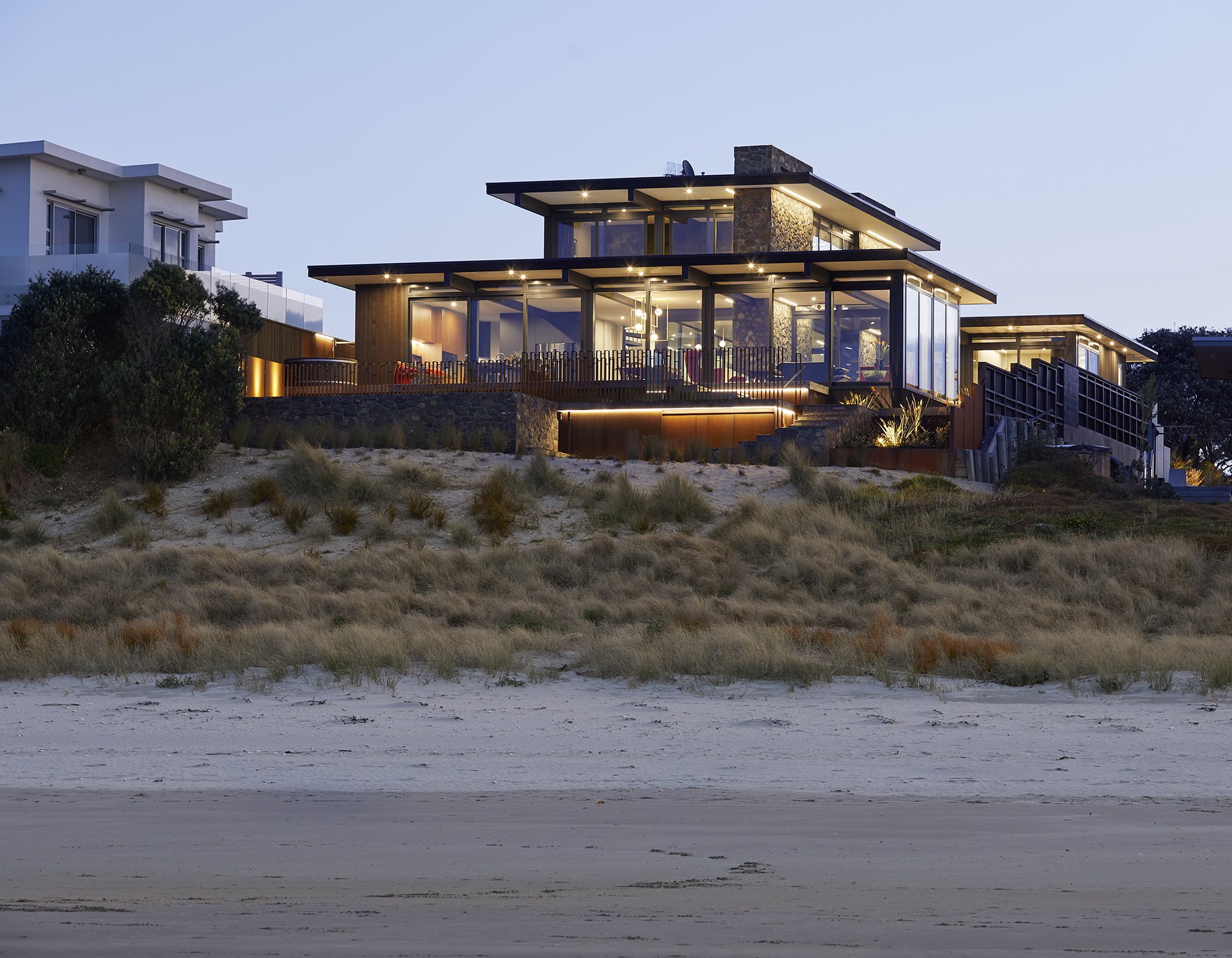 Designed around its oceanfront site, the house opens itself fully to the beach while maintaining privacy and shelter where it’s needed. A restrained mix of stone, timber, glass, and metal gives the home durability and texture suited to its coastal environment. A thin linear roof and exposed steel framing establish clear architectural lines, while floor-to-ceiling glazing strengthens the connection between interior spaces and the outdoors.